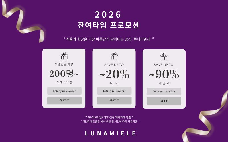 이벤트 & 프로모션 Special Offers 감각부터 다른 루나미엘레만의 이벤트를 만나보세요. 2027년 전체 상담 오픈 문의가 많았던 27년 하반기 상담이 오픈 되었습니다. 사계절 동안 다르게 펼쳐지는 루나미엘레의 배경을 기대해주세요 - 기간 2026/04/08 ~ 2026/10/31 자세히 보기 2026년 잔여타임 프로모션 2026년 잔여타임 프로모션 기간 2026/04/06 ~ 2026/09/30 대상 26.04.13(월) 이후 신규계약자에 한함. 자세히 보기 1